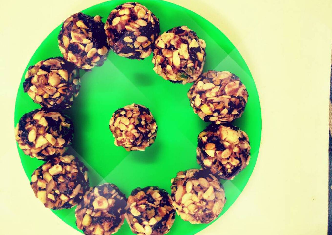 - ##Dry #fruit #laddoo Take 3 cups fav. dry fruits. Cut them into small pieces. I used almond, cashew, pistachio, lil melon seeds and lil grated coconut. Dry roast and set aside. Take 2 tsp desi ghee in pan. Add 3 cups of seedless mashed date (khajur). Saute 3-4 mint. on medium heat and add roasted dry fruit. Mix well and saute 2 min. You can also add raisins. Off the flame and make laddoos and serve.