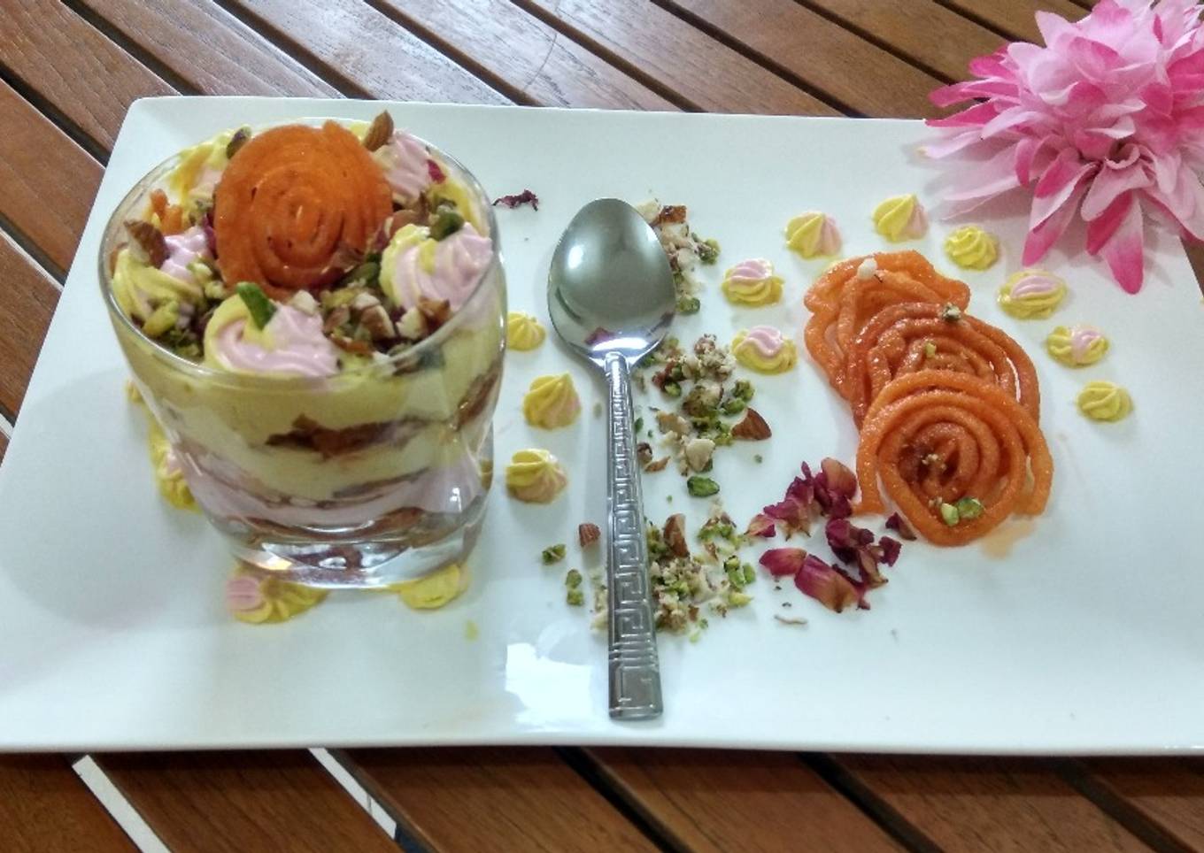 - Take ready made jalebies and break them in to pieces.,and take 1/2 bowl cream cheese (I used homemade)you can substitute it with fresh hung curd or shrikhand if you wish.and add 1-2 tbsp rose syrup.keep it aside.for another layer take 3/4 cup of whipped cream and add 1/4 tsp cardamom powder and pinch of saffron.keep it aside.