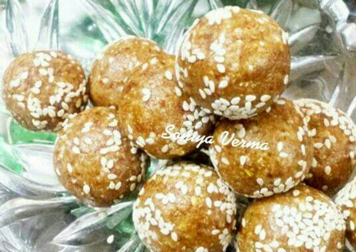- Hath mein ghee laga ke laddu bandh le til se coating karein.